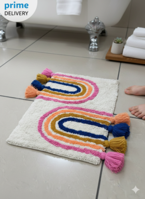 Boho Rainbow Bath Mat – Soft Cotton Tufted Shag Bathroom Rug with Tassels, Colorful Absorbent Machine Washable Floor Mat for Kids Bathroom, Nursery, Entryway & Home Decor